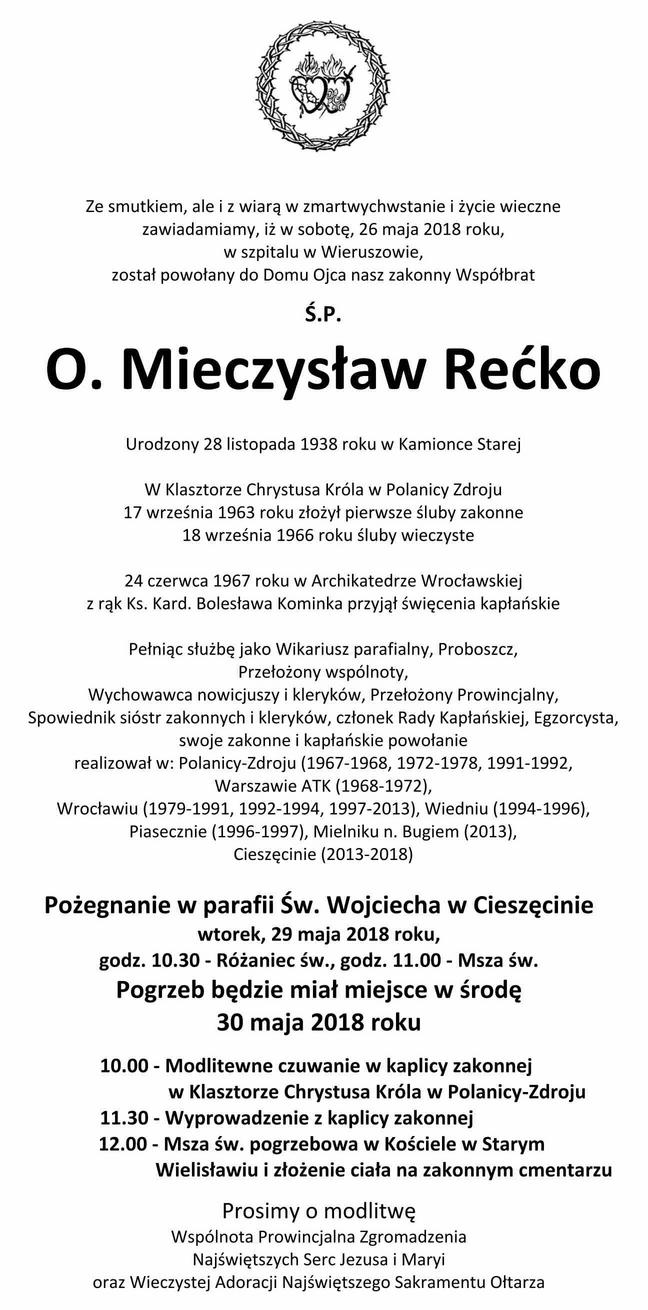 Ze smutkiem informujmy, że wczoraj przeżywszy lat 80 został powołany do Pana O. Mieczysław Rećko SSCC. Posługujący w naszej wspólnocie parafialnej przez ostanie 5 lat. Msza Święta Żałobna pod przewodnictwem Ks. Biskupa odbędzie się w naszym Kościele w Cieszęcinie dnia 29 maja we wtorek o godz. 11.00.