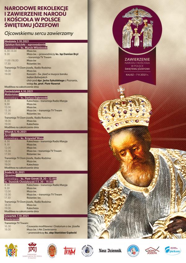 W Kaliszu w dniach od 3 do 7 października br. odbędą się Narodowe Rekolekcje połączone z aktem zawierzenia Narodu i Kościoła w Polsce Świętemu Józefowi. Hasłem rekolekcji są słowa Ojcowskiemu Sercu zawierzamy, które wyrażają głęboką wiarę w moc wstawiennictwa św. Józefa przed tronem Boga. Tematyka rekolekcji dotyczyć będzie kilku przestrzeni: Św. Józef, Opiekun Kościoła; Małżeństwo; Życie św. Józef; Ojcostwo oraz istota i cel modlitwy zawierzenia. Pierwszego dnia rekolekcji (03.10.) odbędzie się koncert Św. Józef w muzyce baroku Indian Boliwijskich w wykonaniu chóru pod dyr. Jacka Sykulskiego z Poznania ze wstępem ks. prof. Piotra Nawrota.