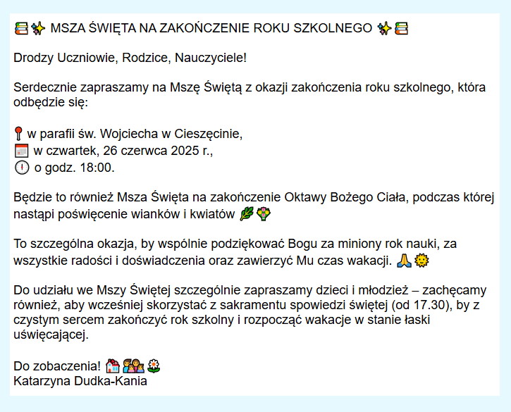 Msza święta na zakończenie roku szkolnego