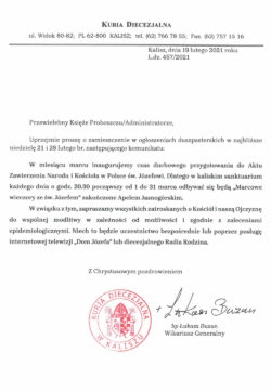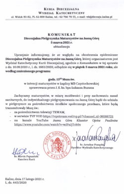 Zachęcamy maturzystów, w miarę możliwości i przy zachowaniu zasad sanitarnych, do indywidualnego pielgrzymowania na Jasną Górę w tym dniu bądź do udziału w pielgrzymce za pośrednictwem środków społecznego przekazu, które będą transmitowały Mszę św.: