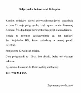 23 maja 2025 roku dzieci pierwszokomunijne wraz z rodzicami, a niektóre również z dziadkami, odbyły pielgrzymkę do Archikatedralnej Bazyliki Prymasowskiej Wniebowzięcia Najświętszej Maryi Panny i św. Wojciecha w Gnieźnie. Nie mogło również zabraknąć proboszcza naszej parafii – ojca Tadeusza. Pielgrzymka była dziękczynieniem Panu Bogu za przyjęcie przez dzieci dwóch sakramentów: pokuty i pojednania oraz Eucharystii. Naszym pielgrzymowaniem chcieliśmy także wyrazić wdzięczność za 30 lat obecności relikwii św. Wojciecha w kościele parafialnym oraz za ustanowienie Sanktuarium św. Wojciecha w Cieszęcinie przez ówczesnego biskupa Stanisława Napierałę.
