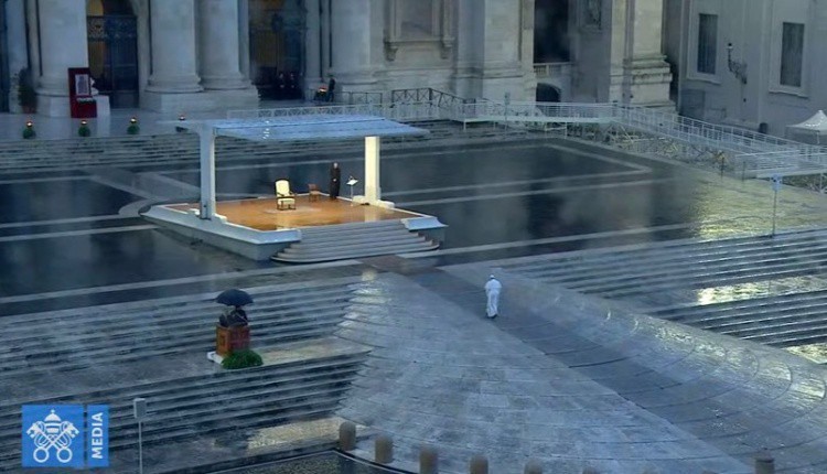 Papież Franciszek przyszedł w piątek na opustoszały, zamknięty plac Świętego Piotra, by przed bazyliką watykańską modlić się o zakończenie pandemii koronawirusa.