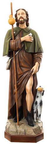 Św. Roch urodził się w 1295 roku jako jedyny syn rządcy Montpellier. Rodzice długo nie mogli mieć dziecka. Uprosili potomstwo modlitwą i jałmużną i urodził im się syn, któremu nadali imię Roch. W wieku 19 lat stracił oboje rodziców. Wówczas sprzedał znaczną część majątku i rozdał biednym po czym ruszył do Rzymu. We włoskim miasteczku Acquapendente zastała go epidemia dżumy. Tam w miejscowym szpitalu opiekował się zarażonymi. Dokonał wielu cudownych uzdrowień. Gdy sam zaraził się tą chorobą ukrył się w lesie, by nie zaszkodzić innym. Według podania wytropił go tam pies, który następnie przynosił mu jedzenie. Miał wówczas wtedy cudownie wyzdrowieć. W drodze powrotnej na granicy został wzięty za szpiega i umarł potem w więzieniu.