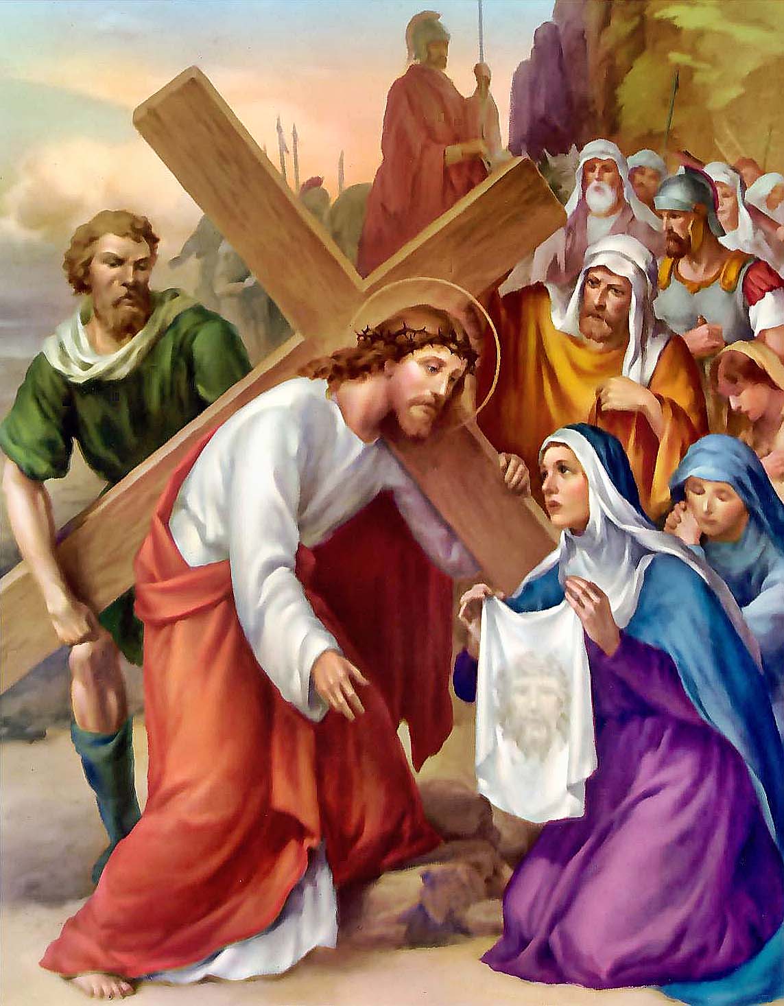 Panie Jezu, w czasie drogi krzyżowej Weronika przecisnęła się przez tłum i chustą otarła Twoją twarz. Nagrodziłeś jej odwagę – dałeś jej swój wizerunek, w który zapewne wpatrywała się wiele razy.