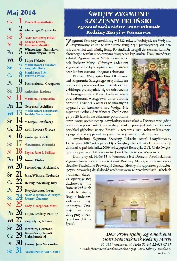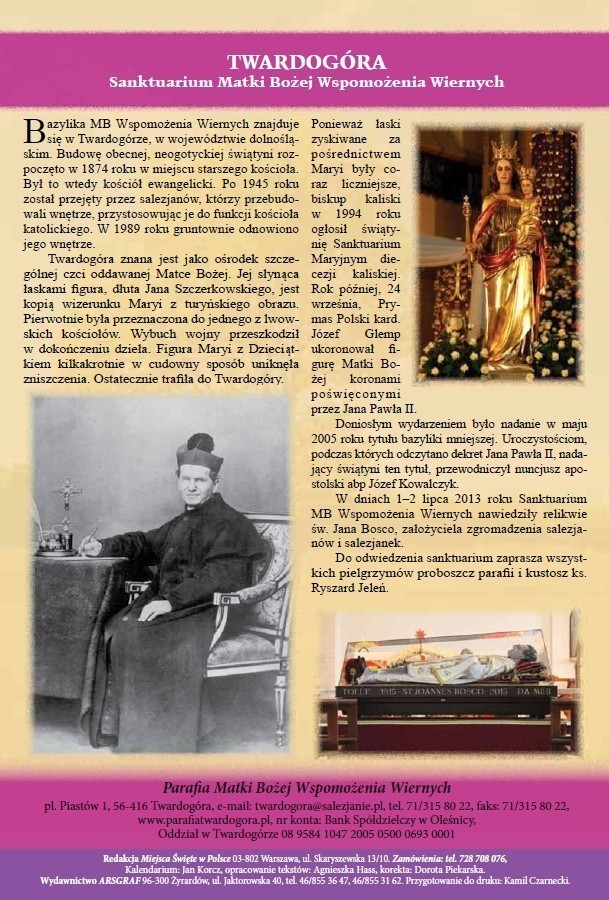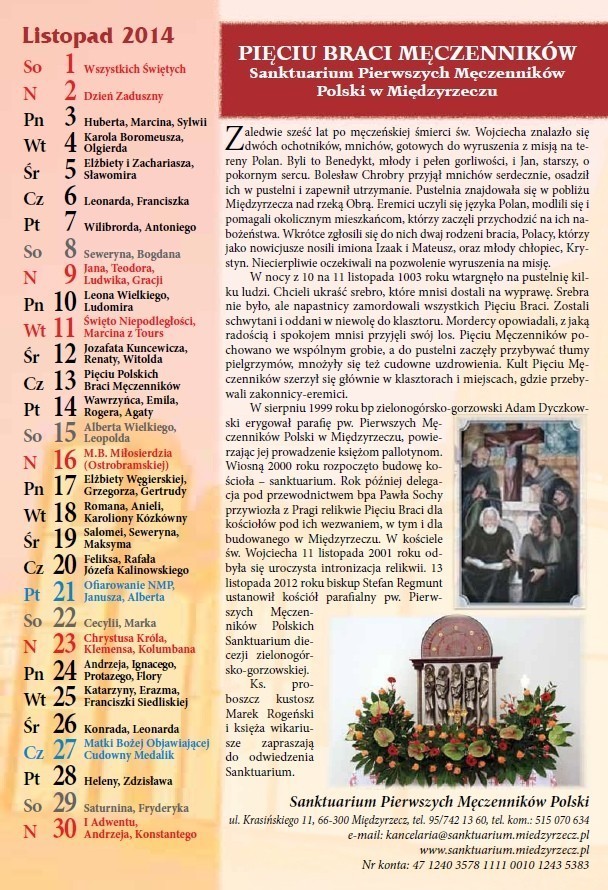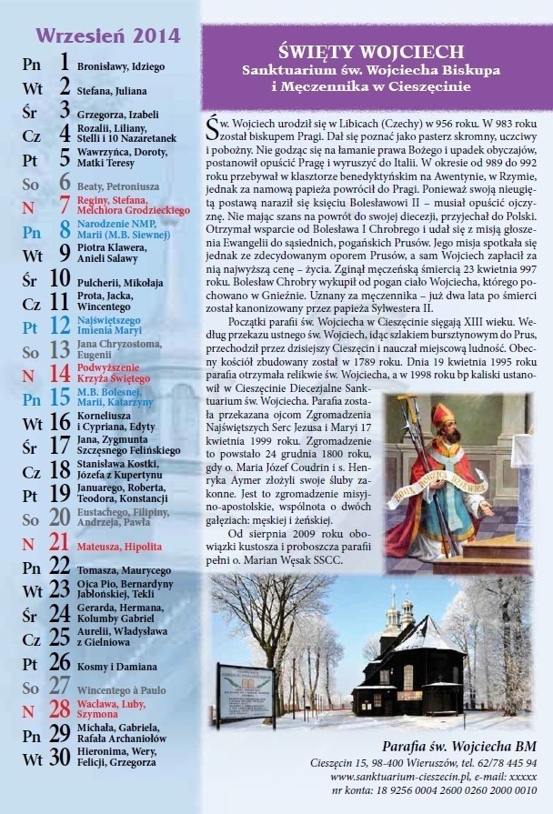 kalendarz_2014         Redakcja portalu SANKTUARIA POLSKIE.INFO przygotowała kalendarz ścienny na 2014 rok pt. „Nasi patroni”.  W śród wielu miejsc w Polsce, opisanych w kalendarzu, znalazło się także nasze sanktuarium. Kalendarz będzie możliwy do zakupu w parafii z końcem roku. Autorami zdjęć o Cieszęcinie są: Janusz Kania i Ryszard Zych.