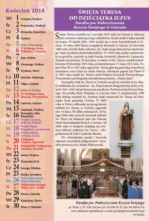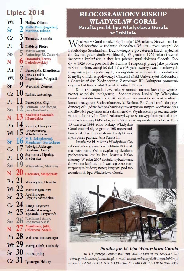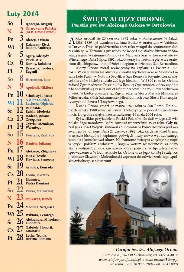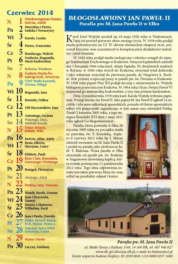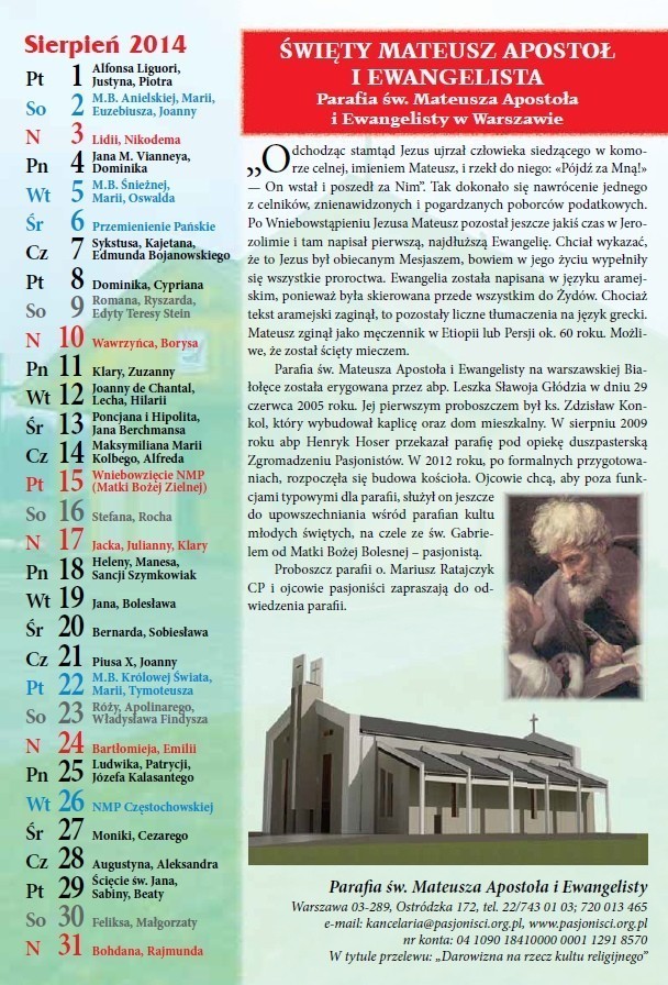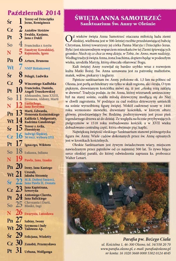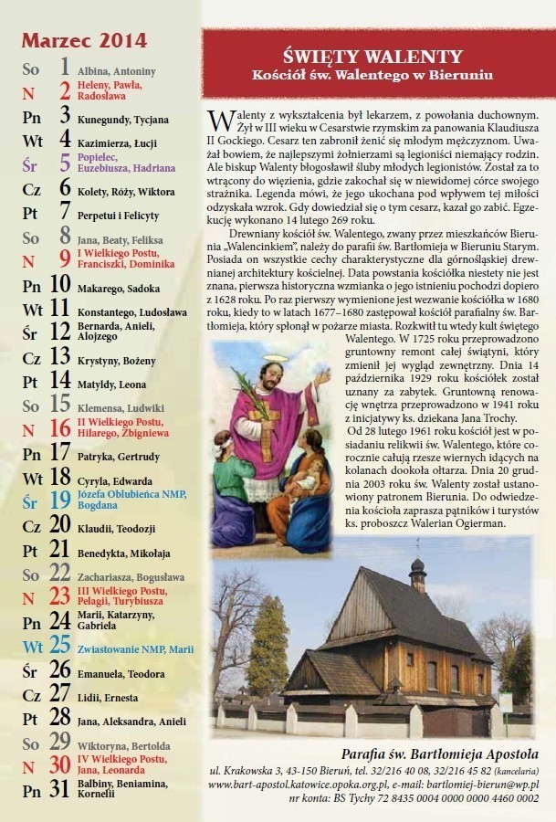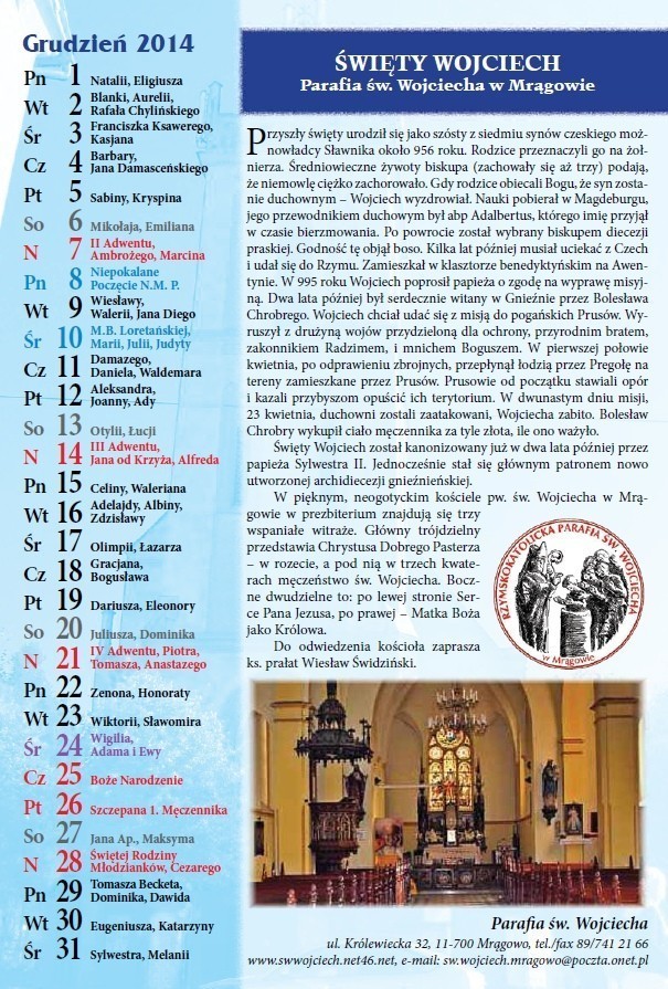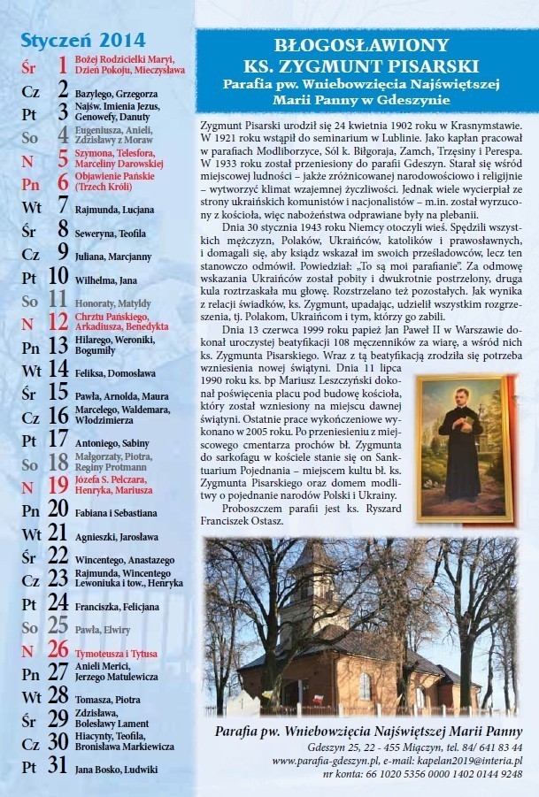 Kalendarz na 2014 r. z opisem poświęconym naszej parafii