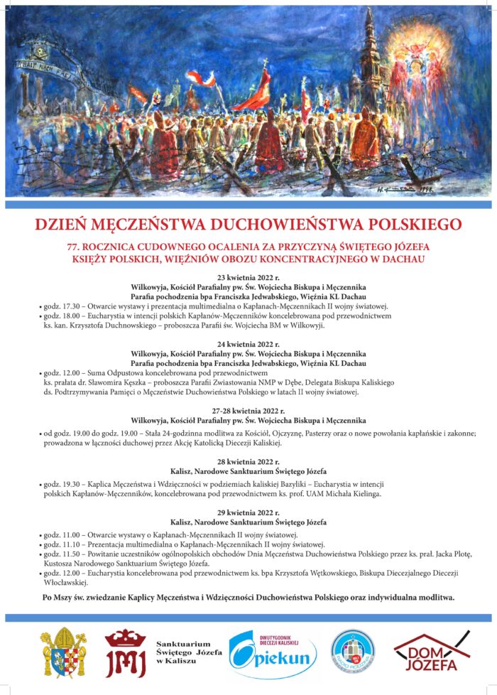 29 kwietnia uroczystości w Narodowym Sanktuarium św. Józefa w Kaliszu rozpoczną się o godz. 11.00 otwarciem wystawy i prezentacją multimedialną o kapłanach – męczennikach II wojny światowej. W południe Mszy św. przewodniczyć będzie biskup włocławski Krzysztof Wętkowski. Po Mszy św. wierni będą mogli zwiedzić Kaplicę Męczeństwa i Wdzięczności oraz Muzeum Księży Dachauowczyków znajdujące się w podziemiach kaliskiej bazyliki.