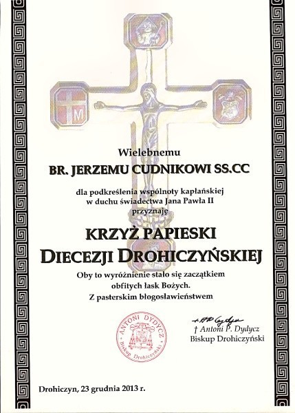 Na spotkaniu opłatkowym kapłanów diecezji drohiczyńskiej w dniu 23 grudnia 2013 r. Ksiądz Biskup drohiczyński Antoni Dydycz odznaczył Papieskim Krzyżem Diecezji Drohiczyńskiej Br. Jerzego Cudnika SS CC.