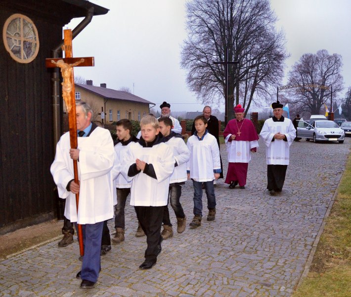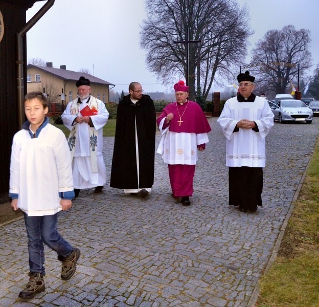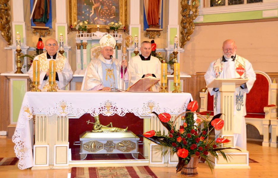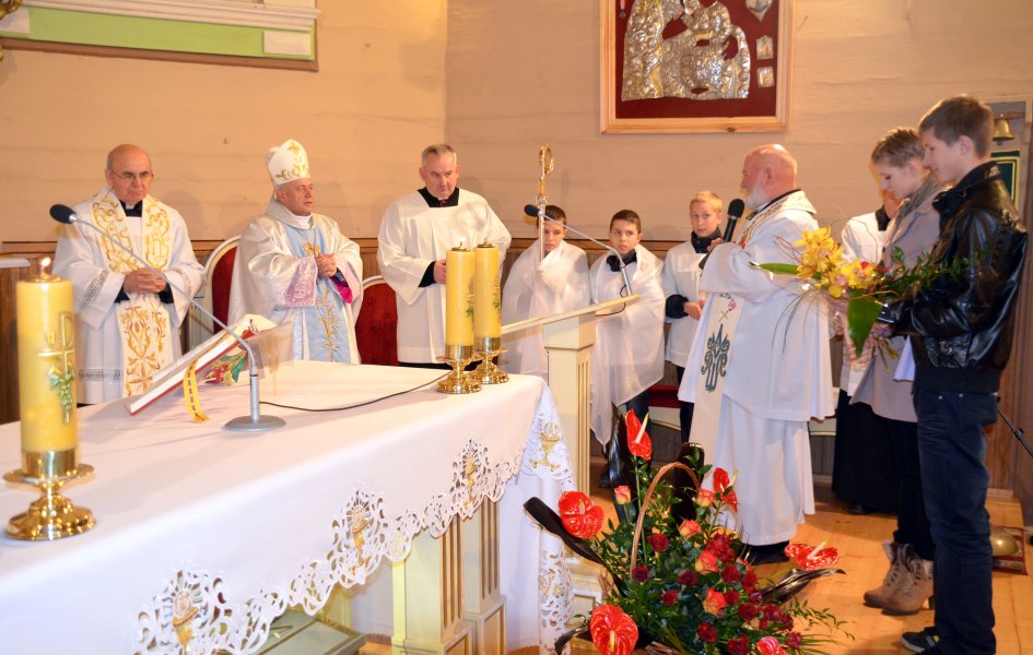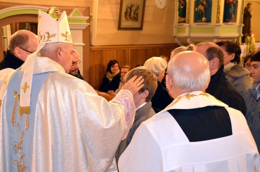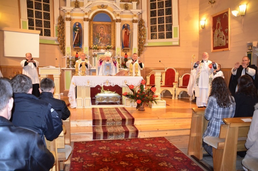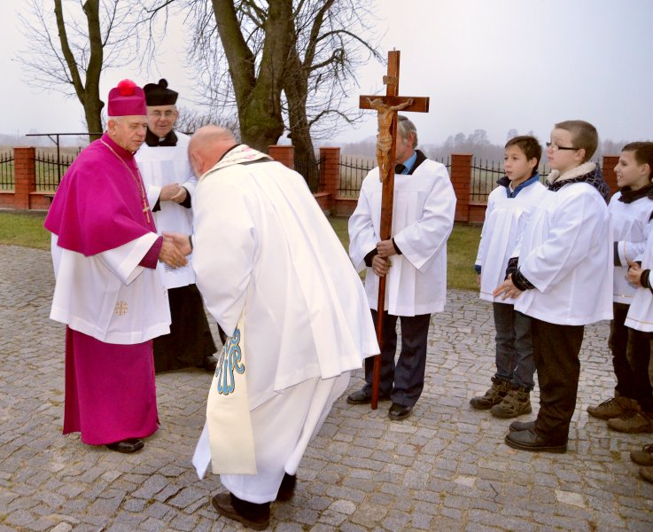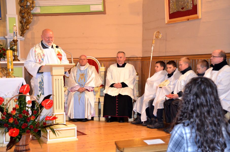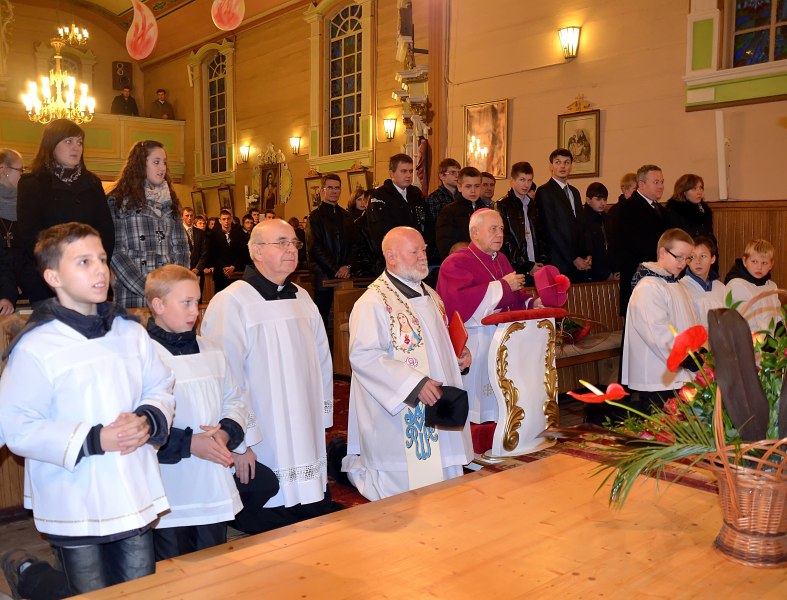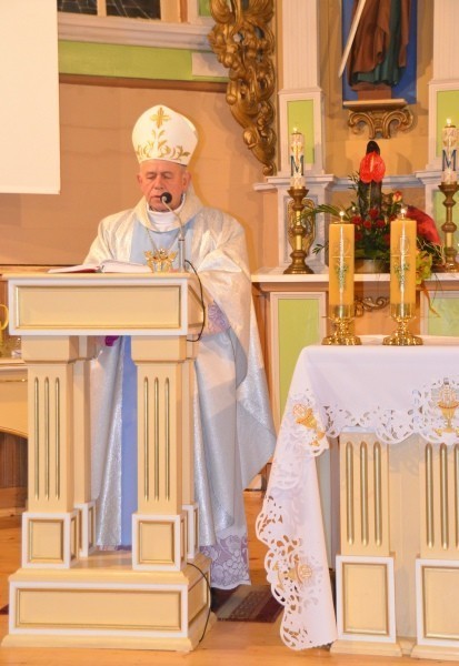 Przed godz. szesnastą w bramę kościoła podjechało auto z którego wysiadł zaproszony na uroczystość ks. biskup Stanisław Napierała – dziś już na emeryturze ale gdy ustalany był termin udzielenia sakramentu bierzmowania był biskupem ordynariuszem diecezji kaliskiej. Po wejściu do świątyni i krótkiej modlitwie ks. biskup ubrał  szaty liturgiczne i rozpoczął mszę św.