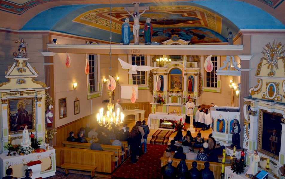 Nad głowami bierzmowanych unosiła się wielka papierowa gołębica i siedem płomieni – symboliczna i wymowna dekoracja mówiąca o tajemnicy wieczernika w pięćdziesiąt dni po zmartwychwstaniu Jezusa.
