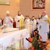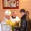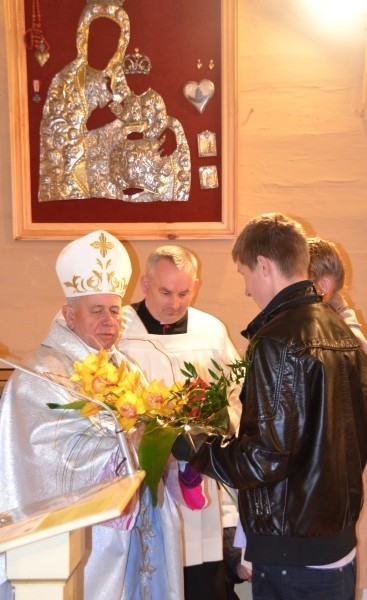 Ks. biskup ze znanym nam życzliwym uśmiechem przyjął powitalne kwiatki i kontynuował mszę św. W słowie skierowany przede wszystkim do młodzieży ale też i do ich rodziców przypomniał, że naszym życiowym celem jest niebo czyli nasze zbawienie i że wszyscy jesteśmy w trakcie realizacji tego celu, a krzyżyki pamiątki bierzmowania będą o tym całe życie przypominać.