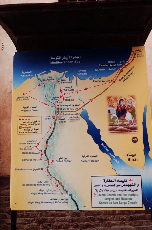 Podróż rozpocznie się od obszaru starego Kairu, który jest znany ze swej Babilońskiej Twierdzy, gdzie Święta Rodzina mieszkała w jaskini, która znajduje się w kościele św. Sergiusza. Dalej trasa prowadziłaby m.in. do wioski Matariya, gdzie rośnie tzw. „Drzewo Maryi”, pod którym zgodnie z tradycją Święta Rodzina miała wypoczywać. Obejmowałaby też poświęcony Maryi kościół w Jabal al-Tayr, przy którym Jezus zostawił na skale odcisk swej dłoni, chroniąc rodziców przed spadającym głazem. Na końcu trasy byłby klasztor Dayr al-Muharrak, w gubernatorstwie Asjut, stojący w miejscu, gdzie zatrzymali się na ostanie sześć miesięcy, przed swym powrotem do Palestyny.